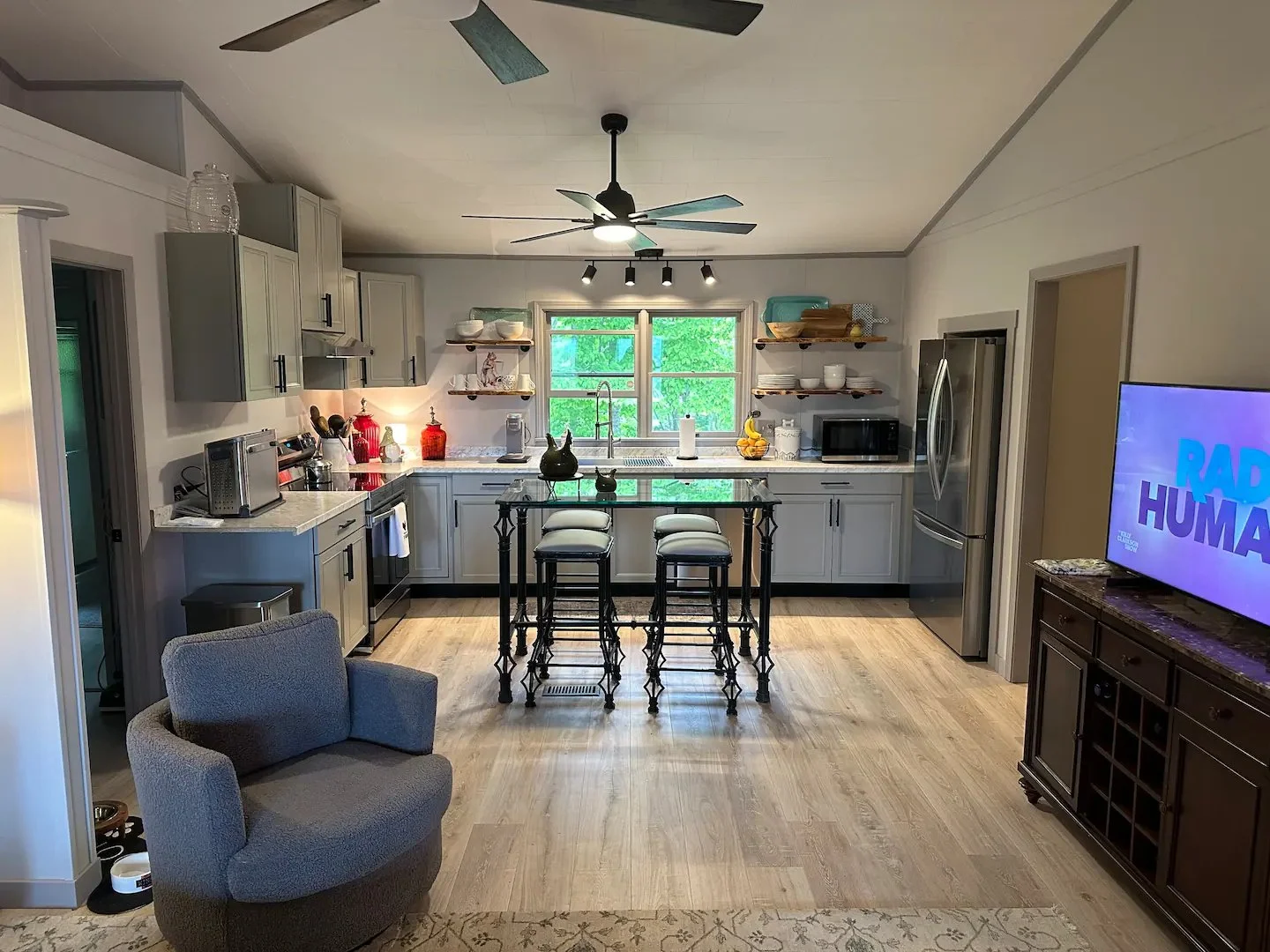 Kick back and relax in Midcentury Modern style at The Treehouse! This gorgeous cabin has all the amenities of a home in a beautiful mountain setting. Perfect for a working vacation, a romantic getaway, or just a fun weekend. Loaded with high-tech, work-at-home features, yet still cozy and rustic with a midcentury vibe. Minutes from spectacular shopping and dining in Blue Ridge and Ellijay, vineyards, orchards, hiking, and outdoor activities. Also, see our sister property, "The Lodge" next door!